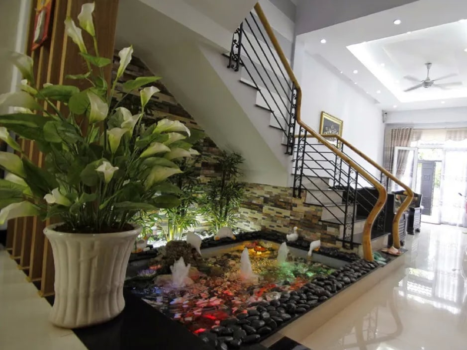 Đã bao giờ bạn nghĩ tới ý tưởng xây hồ cá koi trong nhà? Đây cũng là 1 trong những loại hình rất được ưa chuộng hiện nay. Chúng ta có thể tận dụng không gian bên dưới cầu thang, lối đi trong nhà để xây hồ cá koi kích thước vừa phải.