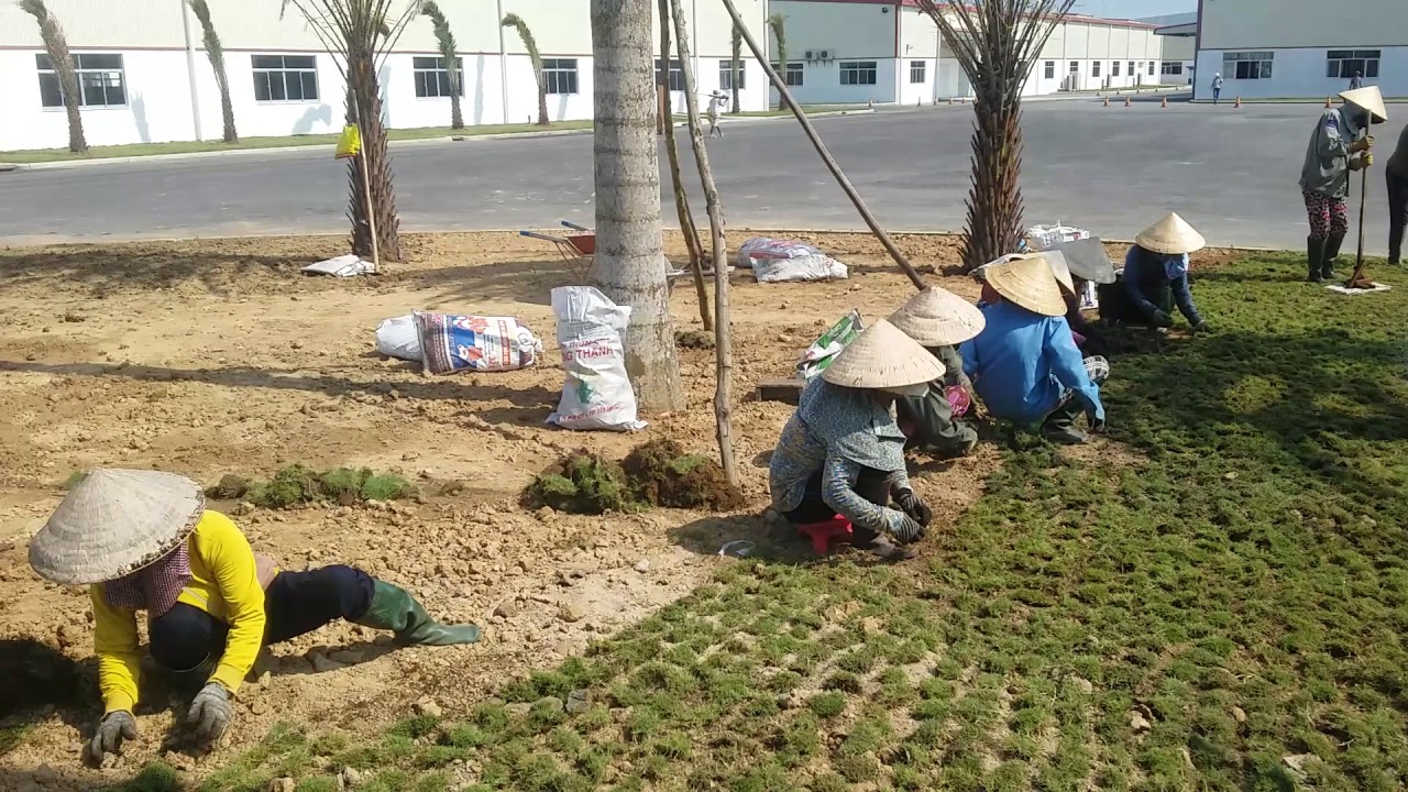 Với cỏ thảm: trồng theo từng miếng được cắt vuông vức, 2 miếng thảm cỏ kề nhau đặt sát theo đường mí, không chồng chéo lên nhau.