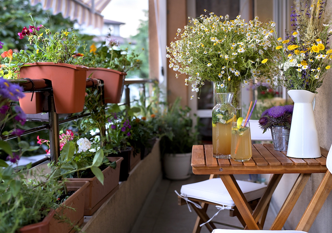 - Tiểu cảnh ban công trang trí những hồ cá, những chậu hoa tươi, dây leo, cây xanh treo trên lan can, bức tường 2 bên.